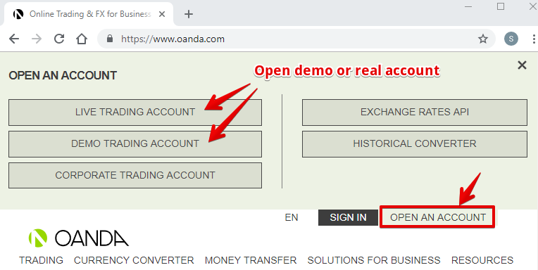 After completing registration and confirming your account, go to your OANDA account. To do this, use your Username and Password.