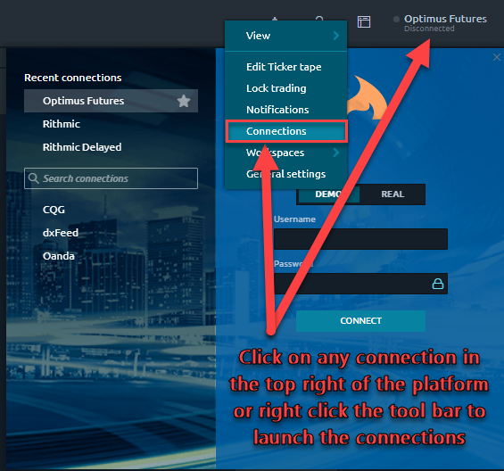 <figure><img src="https://3544171604-files.gitbook.io/~/files/v0/b/gitbook-x-prod.appspot.com/o/spaces%2F-LvquTYs4Kw8odYPu7JS%2Fuploads%2FbbAFBGobLgrhCVHVMZSY%2Fimage.png?alt=media&#x26;token=afb1ebaa-1a16-4628-97a9-aafbac6d8c79" alt=""><figcaption><p>Click on "Optimus Futures - Disconnected" in the top right or right-click your toolbar to access the connection manager.</p></figcaption></figure>